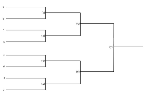Single elimination rounds are seeded pairings based on player standings at the end of swiss rounds, as illustrated below.